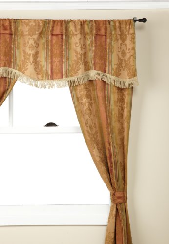 Create a new look to any room with this elegant woven jacquard window treatment. This five piece set features an attached valance with decorative trim. Only rod is needed to hang this set, and you will have a beautiful finished window. Each set includes 2 panels, 1 attached valance and 2 tie backs. 100-percent Polyester. Easy care machine wash and tumble dry.